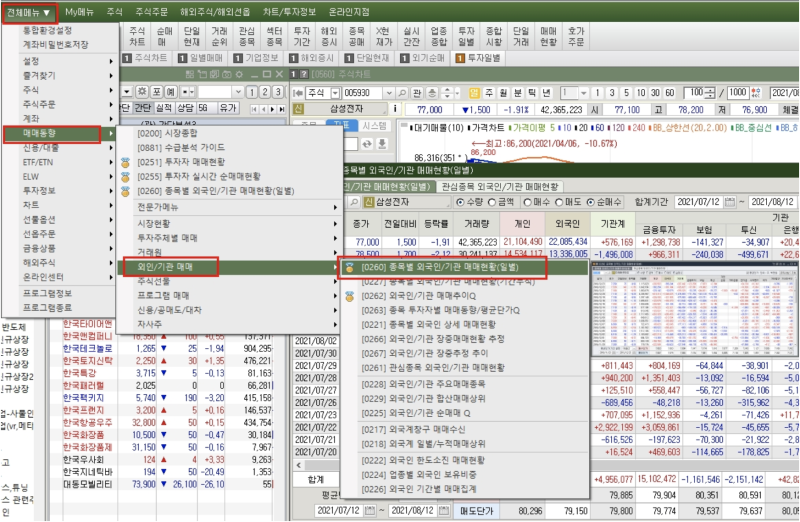 외국인 투자자와 기관 투자자의 수급은 HTS 혹은 MTS에서 확인할 수 있는데요. 미래에셋대우 HTS 기준으로 상단의 '전체메뉴 - 매매동향 - 외인/기관 매매 - [0260] 종목별 외국인/기관 매매현황(일별)'로 들어가면 아래와 같은 화면을 볼 수 있어요.